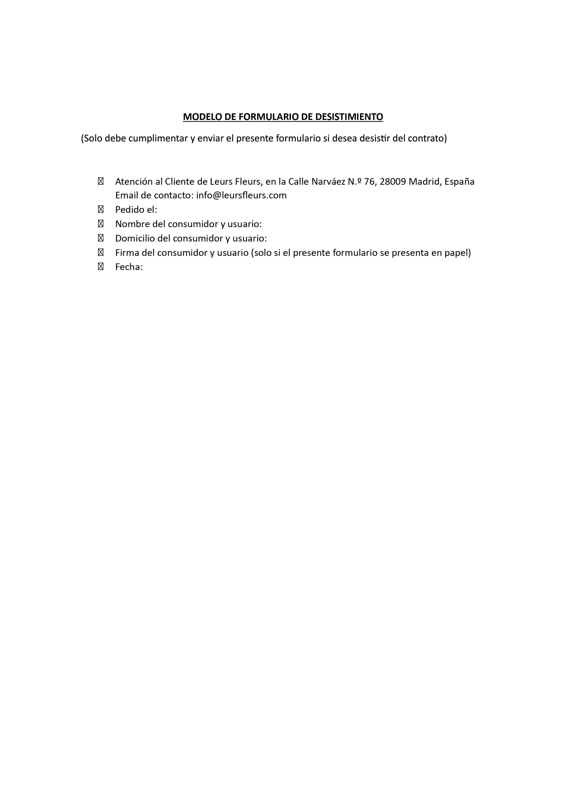 Leurs Fleurs se complace en informar a sus valiosos clientes que, de acuerdo con lo estipulado en la Ley General para la Defensa de los Consumidores y Usuarios (TRLGDCU), tienen el derecho garantizado de ejercer el desistimiento del contrato en un período de 14 días naturales a partir de la fecha de entrega del producto. Este derecho puede ser ejercido sin necesidad de proporcionar justificación alguna y sin incurrir en ningún costo adicional, a menos que se apliquen las excepciones específicas establecidas en la legislación correspondiente.